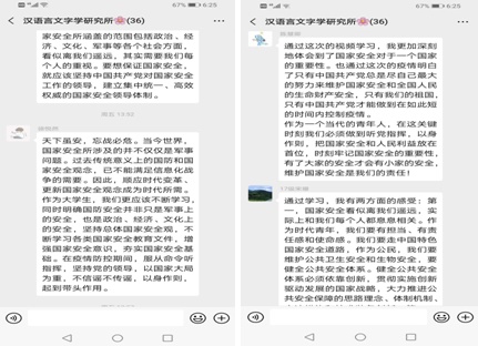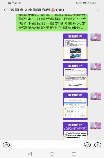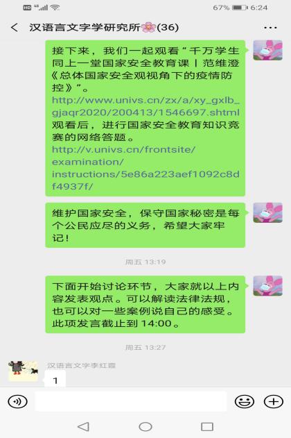 会议以“应对疫情的开学准备”和“国家安全教育”为主要内容,并利用微信群打卡的方式进行了考勤。朱屹楠先后分享了学习文件和资料——《兰州大学新冠肺炎防护手册》返校部分、《国家安全法律法规汇编》等。同学们通过阅读、学习文件,了解了中华人民共和国安全法,并观看了相关案例,深受启发。