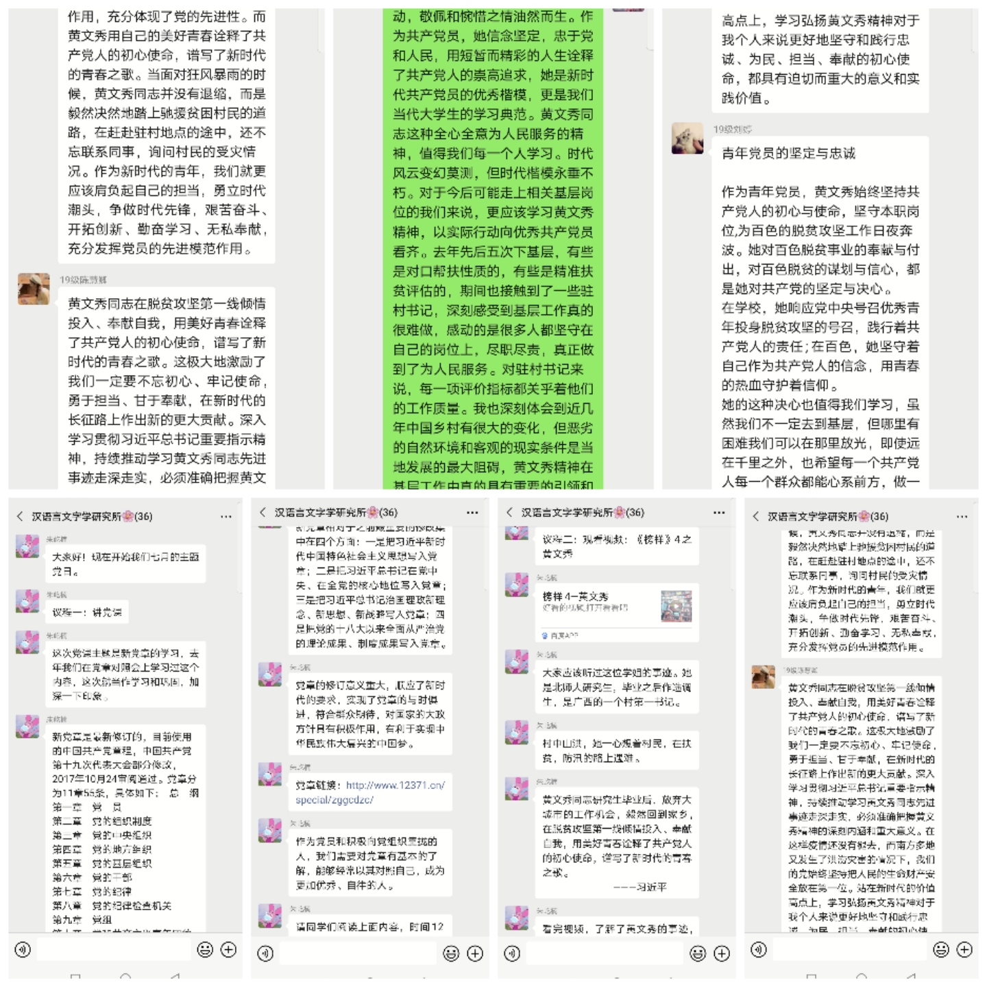 活动观看了视频《榜样》4黄文秀节选,并结合党章和黄文秀精神谈自身感想。海啸同志提到:“当面对狂风暴雨的时候,黄文秀同志并没有退缩,而是毅然决然地踏上驰援贫困村民的道路。作为新时代的青年,我们更应肩负起自己的担当,勇立时代潮头,争做时代先锋,艰苦奋斗、开拓创新、勤奋学习、无私奉献,充分发挥党员的先锋模范作用。”刘婷同志说:“黄文秀的这种决心值得我们学习,虽然我们不一定去到基层,但哪里有困难我们可以在那里放光,即使远在千里之外,也希望每一个共产党人每一个群众都能心系前方,做一些力所能及的事情。”张福英同志说:“最开始看到黄文秀的事迹就深受触动,敬佩和惋惜之情油然而生。对于今后可能走上相关基层岗位的我们来说,更应该学习黄文秀精神,以实际行动向优秀共产党员看齐。”阎然同志说:“黄文秀放弃大城市的工作机会,毅然回到家乡,在脱贫攻坚第一线倾情投入、奉献自我,用美好青春诠释了共产党人的初心使命,谱写了新时代的青春之歌。体现了新时代青年的责任与担当,我们要像她学习,不忘初心、勇于担当、甘于奉献,坚守使命,告诉我们不论在哪里都要发挥党员的先锋模范作用。”郑然同志提到,“作为新时代的青年,黄文秀同志在扶贫工作上,身体力行,不忘初心,她是脱贫攻坚的践行者。做为一名共产党员,我们要像黄文秀同志一样,要主动响应国家和社会的需要,敢于走出舒适圈,要撸起袖子加油干,磨练意志,不怕风雨,能担当、敢担当,勇于担当,这样才能不辱使命。”