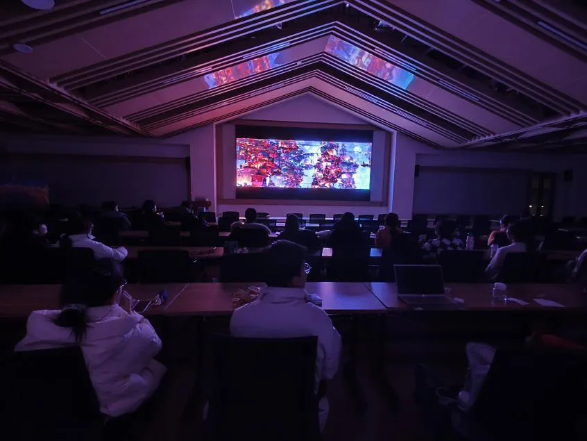 光影交织寻梦旅,记忆永恒暖心魄。活动的压轴部分是集体观赏皮克斯经典动画《寻梦环游记》。当充满拉美风情的旋律响起,色彩斑斓的“亡灵世界”映入眼帘,报告厅渐渐进入一片静谧的观影氛围中。同学们跟随着小男孩米格的脚步,踏上了一场关于回忆、家庭与梦想的奇幻之旅。电影的核心主旨通过亡灵世界的绚丽呈现与“记忆桥梁”的美好意象,传达了人类情感延续的力量——真正的永恒不在于世俗成就,而在于每个被爱的人都能在生者的记忆中获得永生。现场,“心愿桥”上的斑斓卡片与银幕上的绚烂光影交相辉映,青春的心愿与电影中阐述的故事形成了完美的互文,共同诉说每一份真挚的可贵。