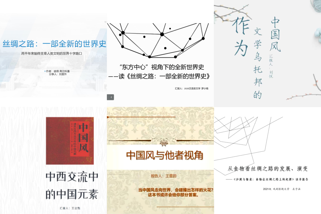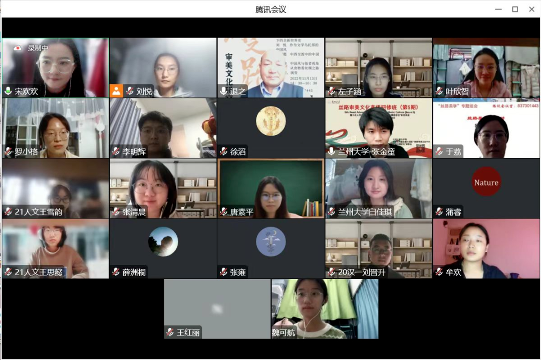 11月13日下午2:30,“丝路审美文化”本科生主题读书会通过腾讯会议顺利举行。该会议以国家社科重大项目“丝路审美文化中外互通问题研究”为核心,以项目下属的“进学读书会”为平台,并自本学期起与本科生“兴趣小组”活动相结合,实现了重大项目研究向本科生教育的延伸与发展。张进老师主持了本次会议,“进学读书会”的各位硕士生、博士生参与者担任会议的评议人,共同指导了“丝路审美文化”科研小组的本科生在会上的报告。来自不同年级的22名同学参加了本次会议。