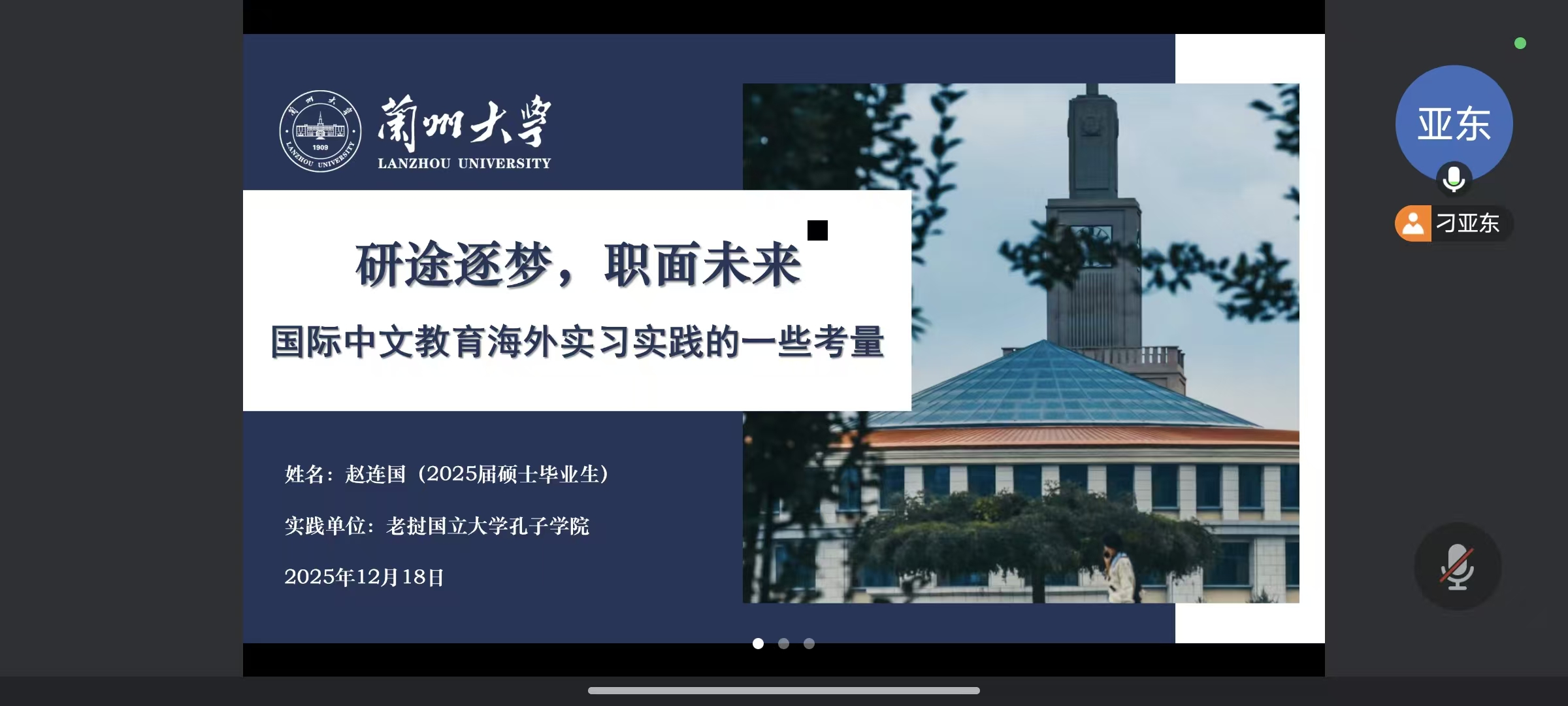 为切实做好学子就业升学指导工作,助力本硕学子明晰海外实习路径、科学规划职业发展,12月18日晚,兰州大学文学院研究生会组织第二期“研途逐梦,职面未来”就业升学经验分享会。本次活动由文学院团委书记刁亚东主持,学院党委副书记、副院长连亚敏出席并指导,2025届汉语国际教育专业硕士研究生、老挝国立大学孔子学院国际中文教育志愿者赵连国担任主讲嘉宾,学院本硕学子线上参与交流。