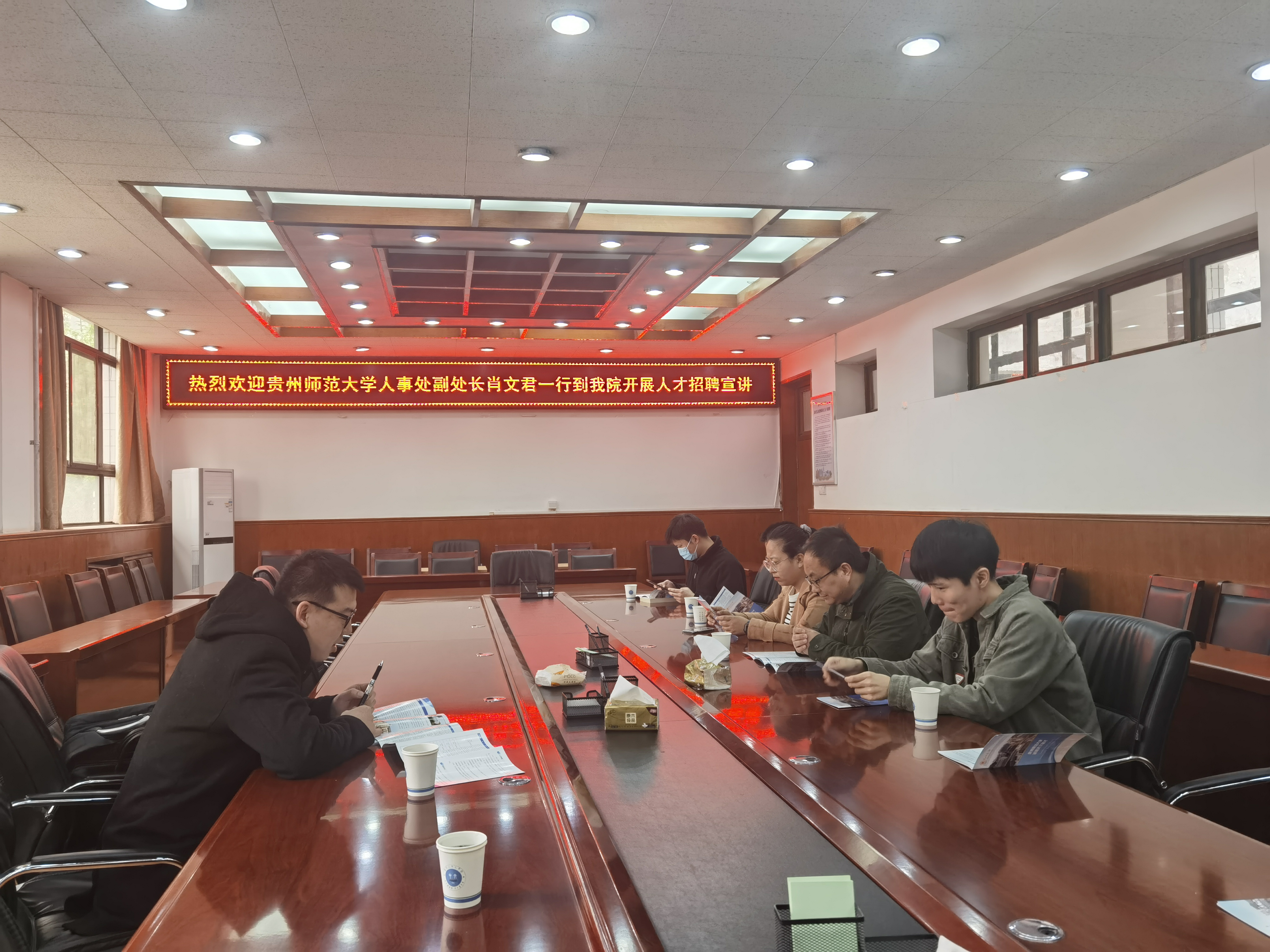 4月27日下午,贵州师范大学人事处副处长肖文君一行来我院招聘,介绍了贵州师范大学基本情况、招聘要求以及招聘政策,我院部分博士研究生参加了此次招聘,肖文君与博士生就招聘程序、岗位职责及薪资待遇进行了交流。