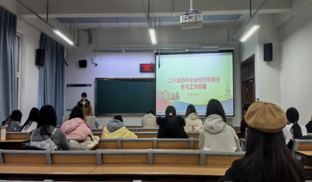 会议伊始,郑楚寅同学带领同学们学习了党的二十届四中全会关于经济工作的决策部署。随后,熊洪同学带领同学们学习“十四五”时期我国经济发展取得的辉煌成就。朱钰瑶同学围绕“开启发展新征程”这一主题,带领大家学习了“十五五”时期我国发展的战略蓝图。
